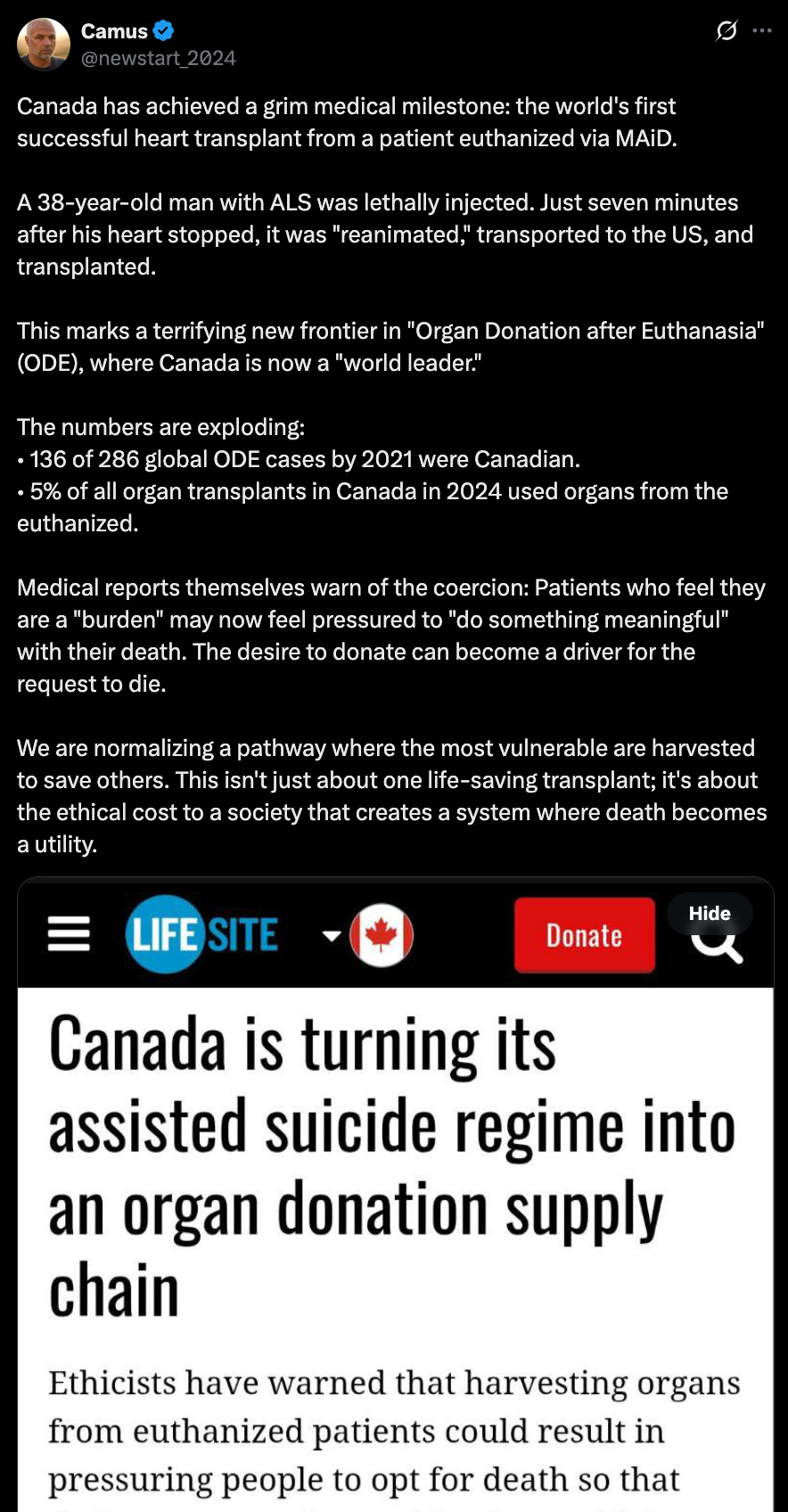 You’ve got to wonder what the downstream effects will be of Organ Donation after Euthanasia (ODE). Will it disincentivize research for diseases like ALS (which is what the MAiD recipient suffered from)? Why try to cure it or other illnesses if those who succumb can provide hearts and other parts to a medical system in need of organs?