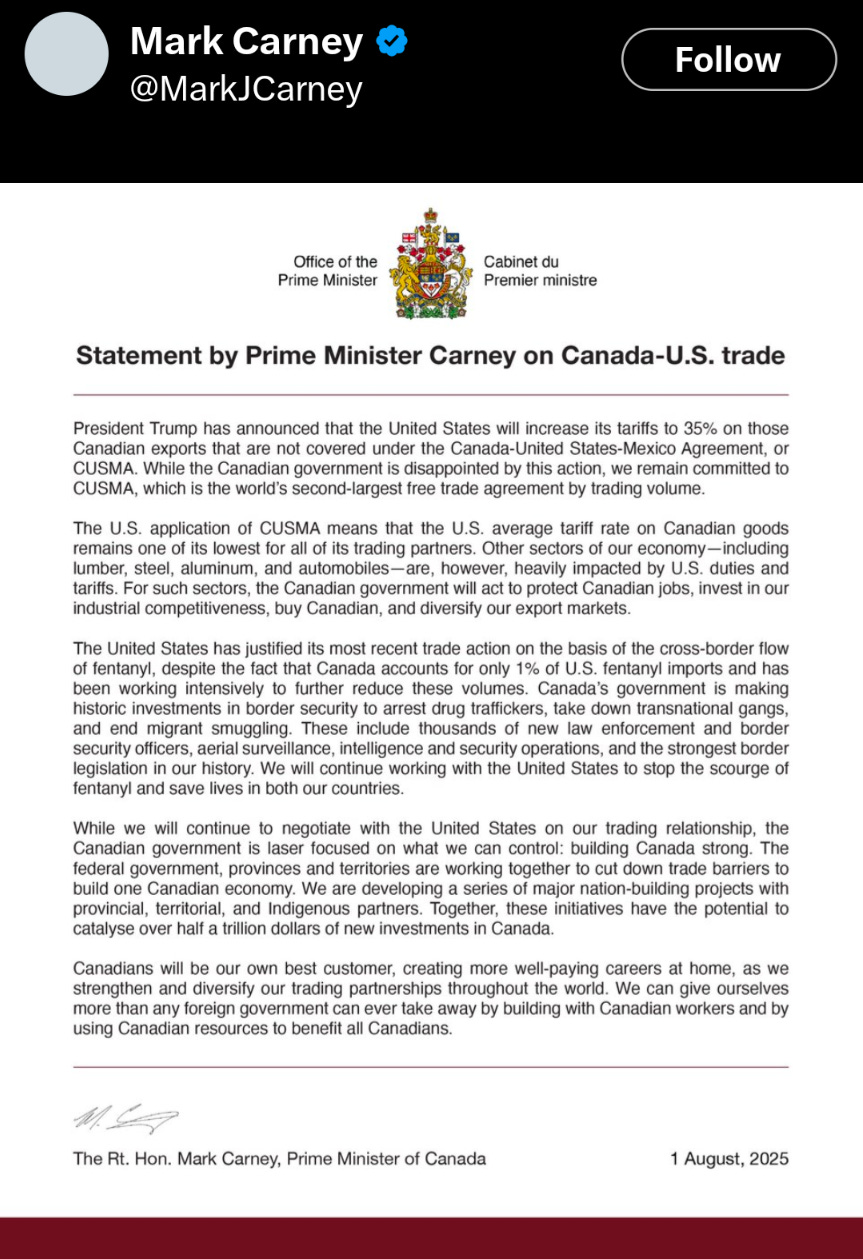 Canadian Prime Minister Mark Carney made a late night X post this week to respond to the tariffs imposed by the US on Canada after failing to reach any sort of agreement.