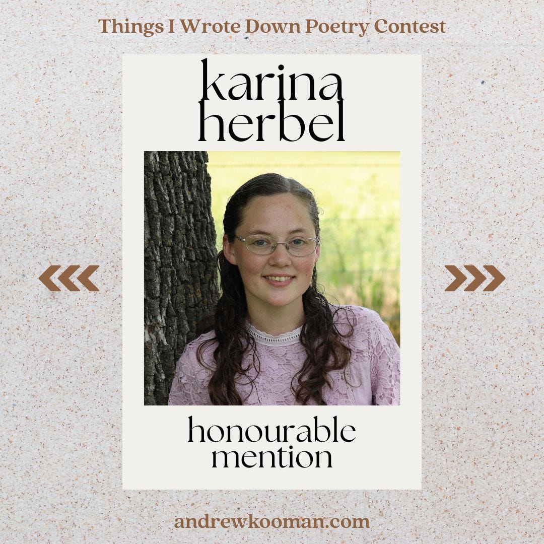 Karina Herbel is daughter to parents who led her to her Savior, sister to her nine best friends, and aunt to a growing number of nieces and nephews. She thinks way more than she speaks, and those thoughts most often find expression on the written page. She tries to capture a portion of her Creator's beauty through every form of art she can, while enjoying His love and the relationships and adventures He sends along the way. Her desire is to ignite a passion in others to pursue Him for themselves through the skill He’s given her fingers. Follow her on Substack.
