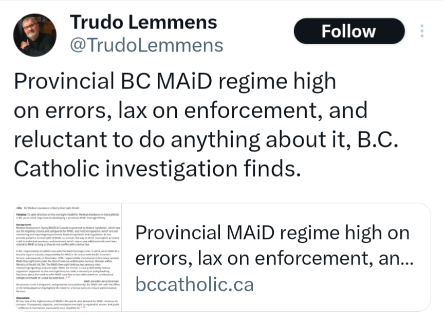 A new report by BC Catholic news reveals truly shocking details of the lack of oversight of euthanasia providers and their live and let die approach to governance.