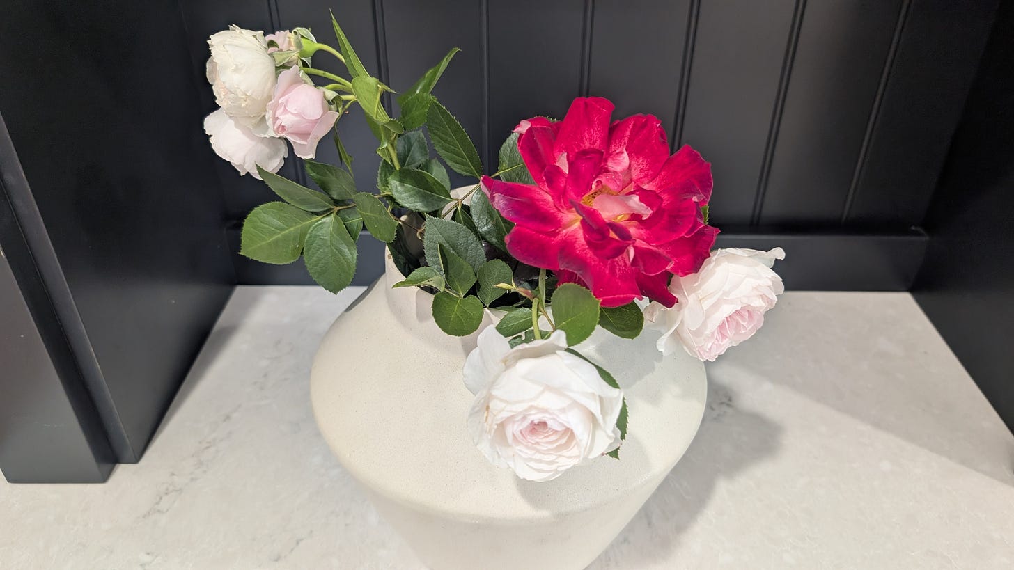 We had our first frost warning of the Fall last night. Not bad for October. I stepped outside a clipped a few roses offering late blooms. We moved shrubs and flowers around this summer, planted new things in our yard, and the roses have thanked us for it.